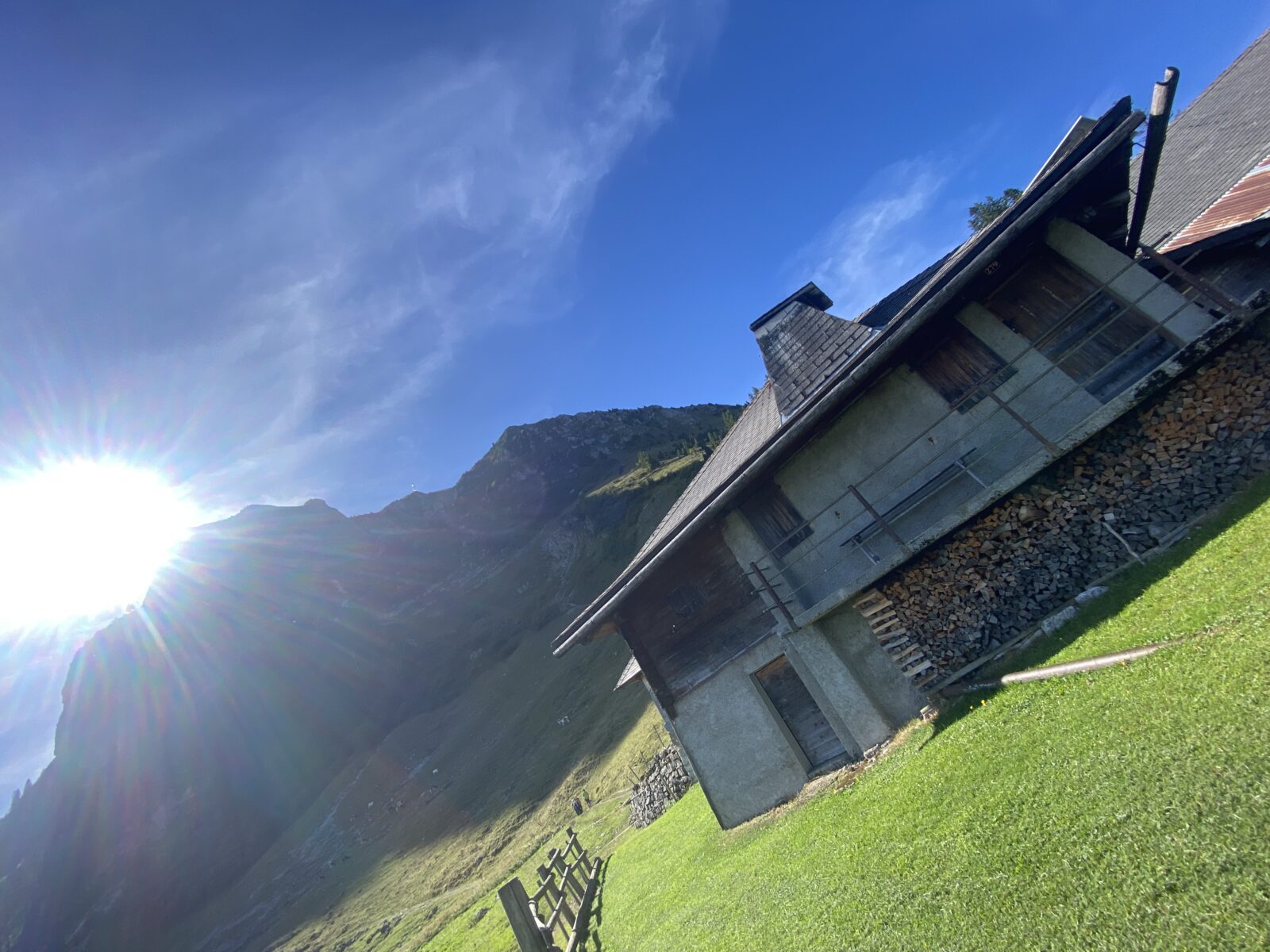 Il y a déjà plusieurs voitures parquées au-dessus de la buvette, je ne serai pas toute seule sur ce parcours. Après une petite montée, je descends à Villars Dessous et le soleil me rejoint. Le chemin carrossable monte ensuite en direction de Gros Plané, une autre jolie buvette, je continue tranquillement en direction de Plan Francey. Une piste de VTT est visible et passe par des endroits où je n’irai pas à vélo.