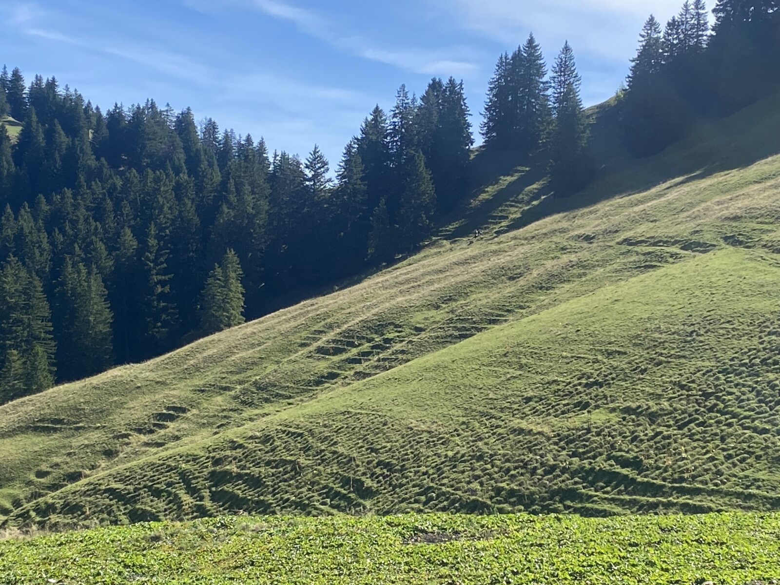 Gros Moléson est une bifurcation qui permet de monter au sommet, de retourner sur Plan Françey, Moléson Village ou de rejoindre la Vudalla. Autant dire qu’il y a de nombreuses possibilités de randonnées variées. Je descends à travers la forêt et croise une vétéiste dans l’autre sens qui pousse son vélo, quel courage. J’arrive à Challa, une autre buvette. Il est presque midi, je m’arrête pour manger un en-cas sans m’attarder, en effet, toutes les tables sont réservées.