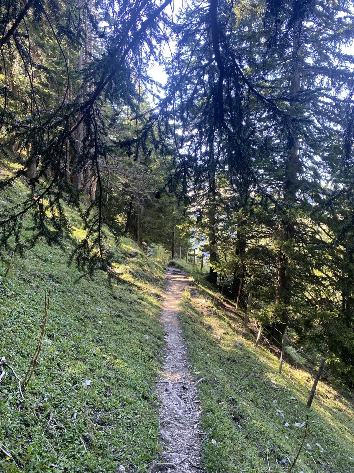 Je me parque un peu en dessous de la buvette d’Incrota, vers les Paccots et rejoins en quelques minutes le parcours officiel. Il y a de la rosée, je suis encore à l’ombre et la température est agréable. Je choisis le sens horaire cette fois-ci.